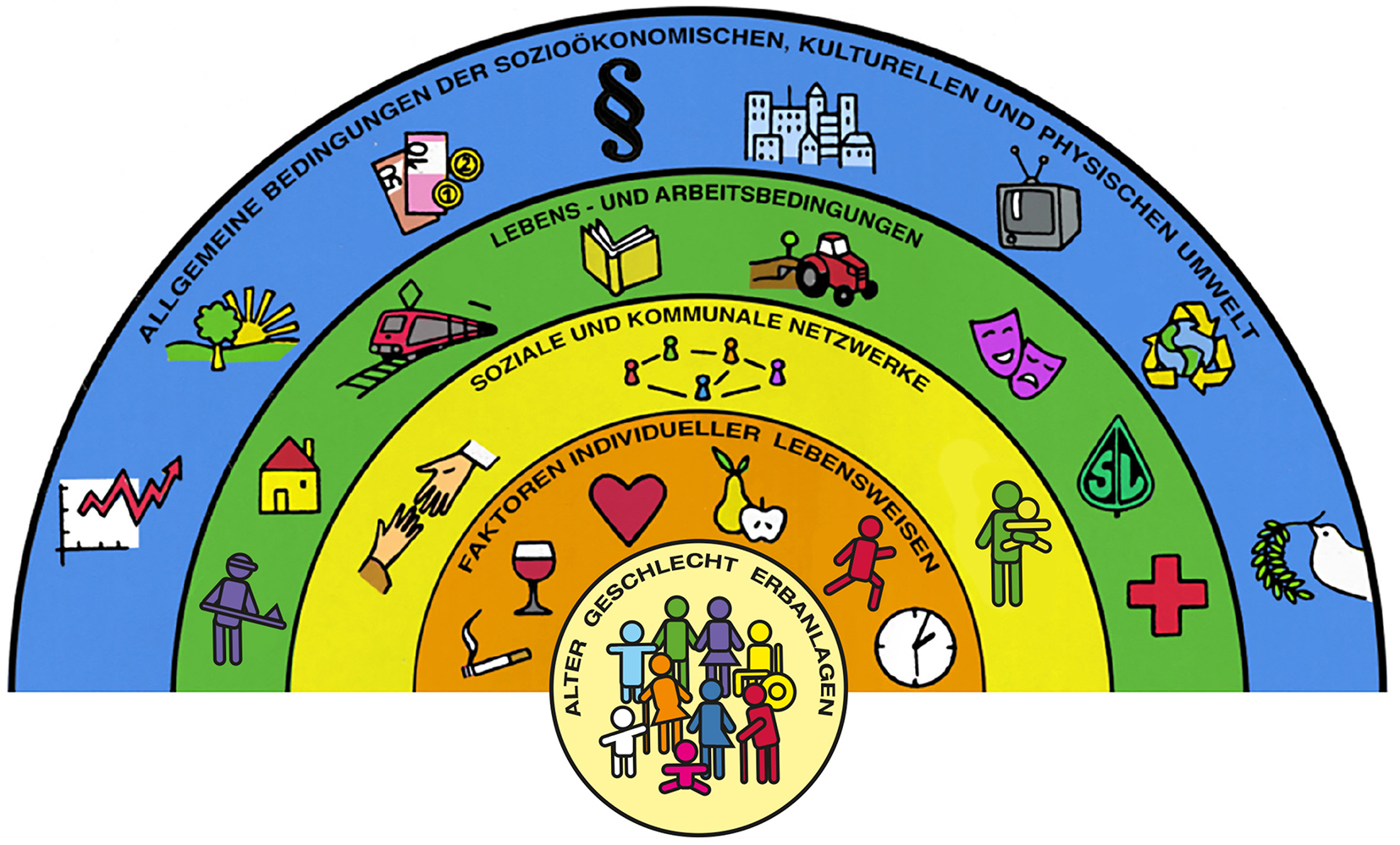 Gesundheitsdeterminanten sind Einflussfaktoren, die auf die Gesundheit der Bevölkerung wirken. Die Grafik zeigt die wichtigsten Determinanten der physischen und sozialen Umwelt, die verändert werden können – und somit Ansatzpunkte für die Gesundheitsförderung darstellen. Entwickelt wurde die Grafik in Anlehnung an Dahlgren und Whitehead (1).
