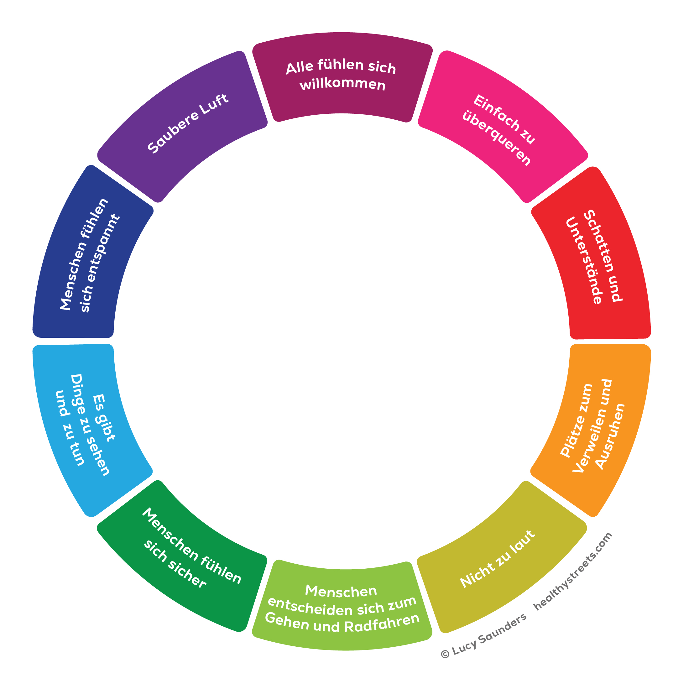 In einer Straße sollten alle Menschen willkommen sein und sich entspannt und sicher fühlen. Alles sollten gerne zu Fuß oder mit dem Fahrrad unterwegs sein und Zeit verbringen. Die 10 Healthy Streets Indikatoren spiegeln menschliche Erfahrungen im Straßenraum wider. Sie sind notwendig, um eine Straße einladend und gesund zu machen.